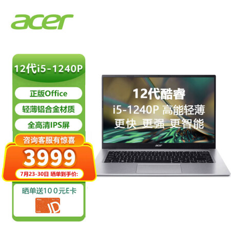 宏碁 Acer 全新12核超能金屬輕薄本 14英寸辦公學(xué)生筆記本電腦 i5-1240P 16G 512G 全高清IPS Office